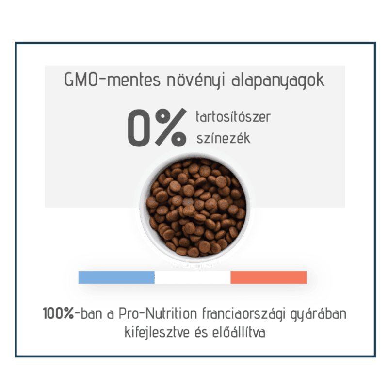 Összetevők:Dehidratált állati fehérjék 36% (szárnyas – ebből csirkehús 11%, sertéshús). Kukorica. Lóbabrost. Búza. Baromfizsír. Almarost. Állati fehérje-hidrolizátumok. Borsó. Céklapép. Lenmag. Kalcium-szulfát. Kálium-klorid. Hal autolizátumok (0,4%). Sörélesztő. Halolaj. Tengeri só. Frukto-oligoszacharidok. Yucca.